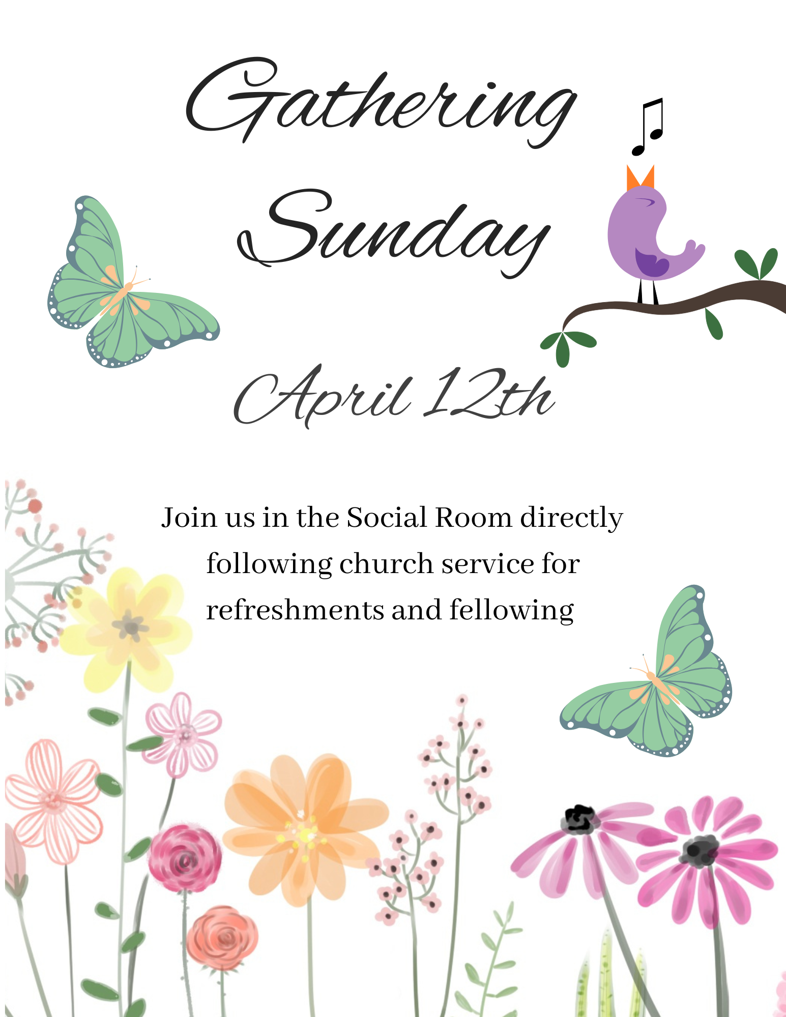 Join us as we gather together on April 12th after worship service in the Social Room. Snacks and refreshments will be provided.